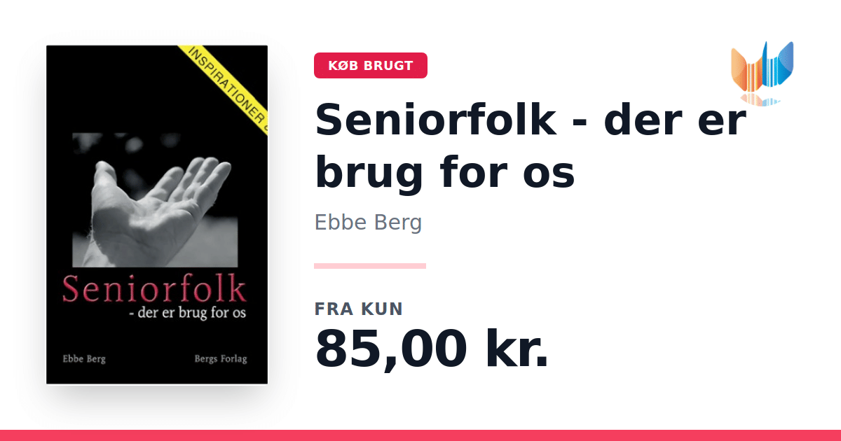 Lige nu kan du købe "Seniorfolk - der er brug for os" af Ebbe Berg til kun 85,00 kr. Bogen du ser her er brugt, og i perfekt stand. Vi har i øjeblikket kun et enkelt eksemplar til salg af "Seniorfolk - der er brug for os", så slå til mens du kan!