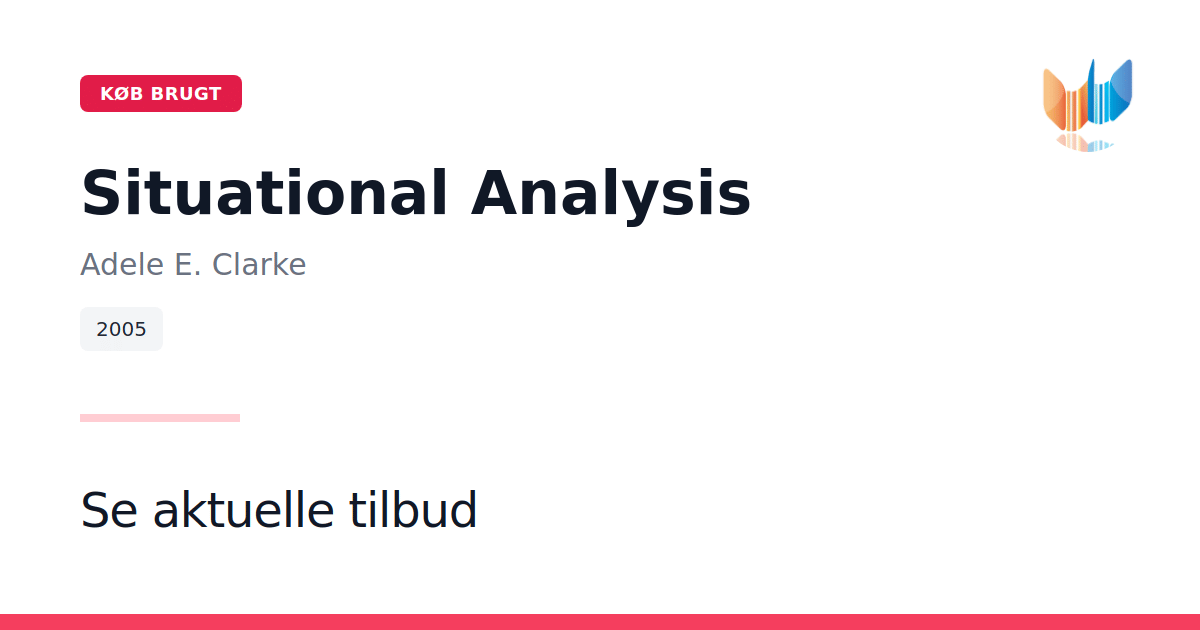 Situational Analysis fra 2005 er Adele E. Clarkes omfattende introduktion til en banebrydende tilgang til kvalitativ dataanalyse. Clarke står som ophavsmand til metodens grundprincipper, som ikke findes samlet i noget andet værk. Bogen placerer situational analysis i forhold til klassisk grounded theory og den bredere tradition for kvalitative metoder. Gennem en detaljeret gennemgang demonstrerer Clarke, hvordan man bevarer grundteoriens kode- og memo-strategier, samtidig med at man åbner for nye analyseperspektiver. Det særlige ved metoden er tilføjelsen af tre typer kort - situational maps, social worlds/arenas maps og positional maps - der kortlægger forskningens komplekse kontekster. Desuden er dette første bog, der anvender grounded theory på historiske, visuelle og diskursive kilder. Med sine 408 sider er bogen et praktisk redskab for forskere, der ønsker at udforske det komplekse samspil mellem aktører, diskurser og materialiteter.