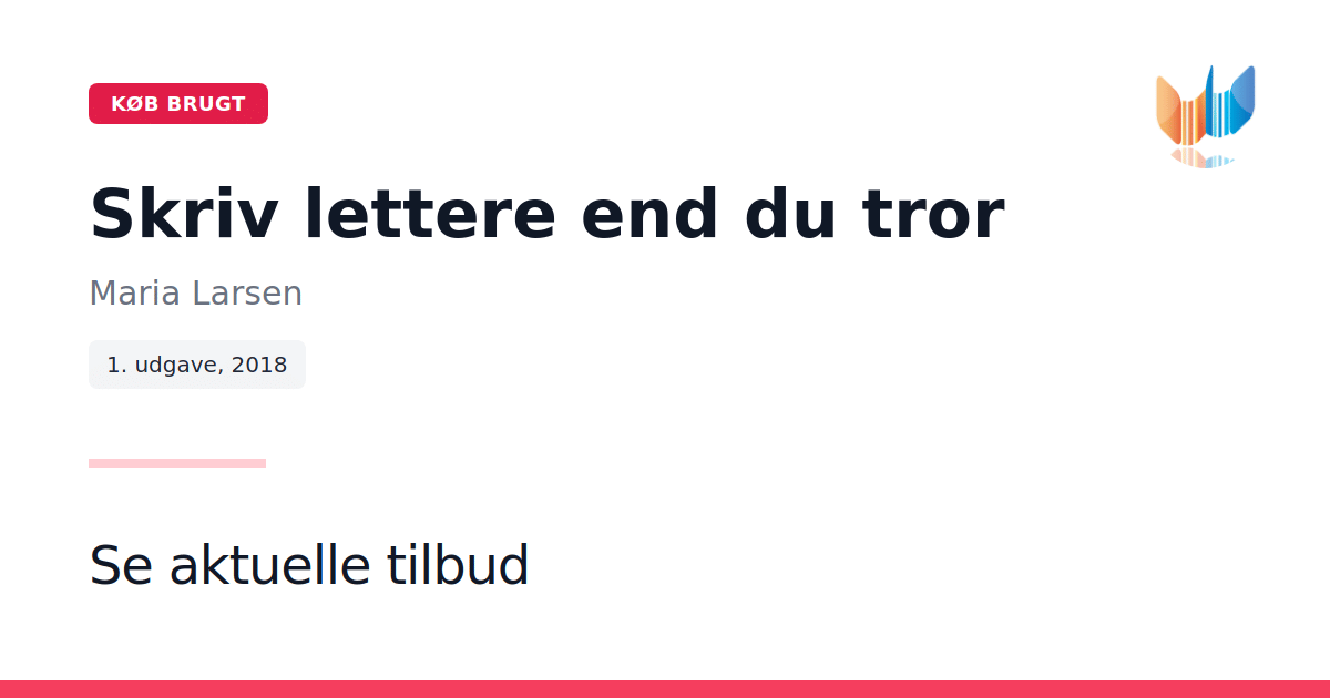 Tænk - når du tænker Skriv - når du skriver Rediger - når du reviderer I Skriv lettere end du tror guider Maria Larsen dig gennem skriveprocessens tre nøglefaser. Ved at adskille tankerne, skriveprocessen og redigeringen, viser hun, hvordan små succeser kan vokse til nye, varige vaner. Gennem konkrete råd og praktiske øvelser lærer du at udtrykke dine idéer klart og effektivt – uanset om du skriver mails, notater, referater eller blogindlæg. Med et fundament i let tilgængelige teknikker, oplever mange, at skrivning ikke behøver at være en besværlig opgave. Maria Larsens metode, som hun også anvender i sit arbejde med virksomheder og organisationer, gør det muligt at skrive mere intuitivt og naturligt. Lad dig inspirere af en tilgang, der lægger vægt på at skrive let og opnå bedre tekster, der både fastholder din læser og gør din kommunikation mere effektiv.