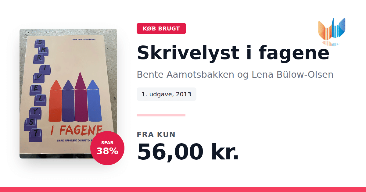 Lige nu kan du købe "Skrivelyst i fagene" af Bente Aamotsbakken og Lena Bülow-Olsen til kun 56,00 kr. Du sparer hele 38% af nyprisen! Bogen du ser her er brugt, og i perfekt stand. Vi har i øjeblikket kun et enkelt eksemplar til salg af "Skrivelyst i fagene", så slå til mens du kan!