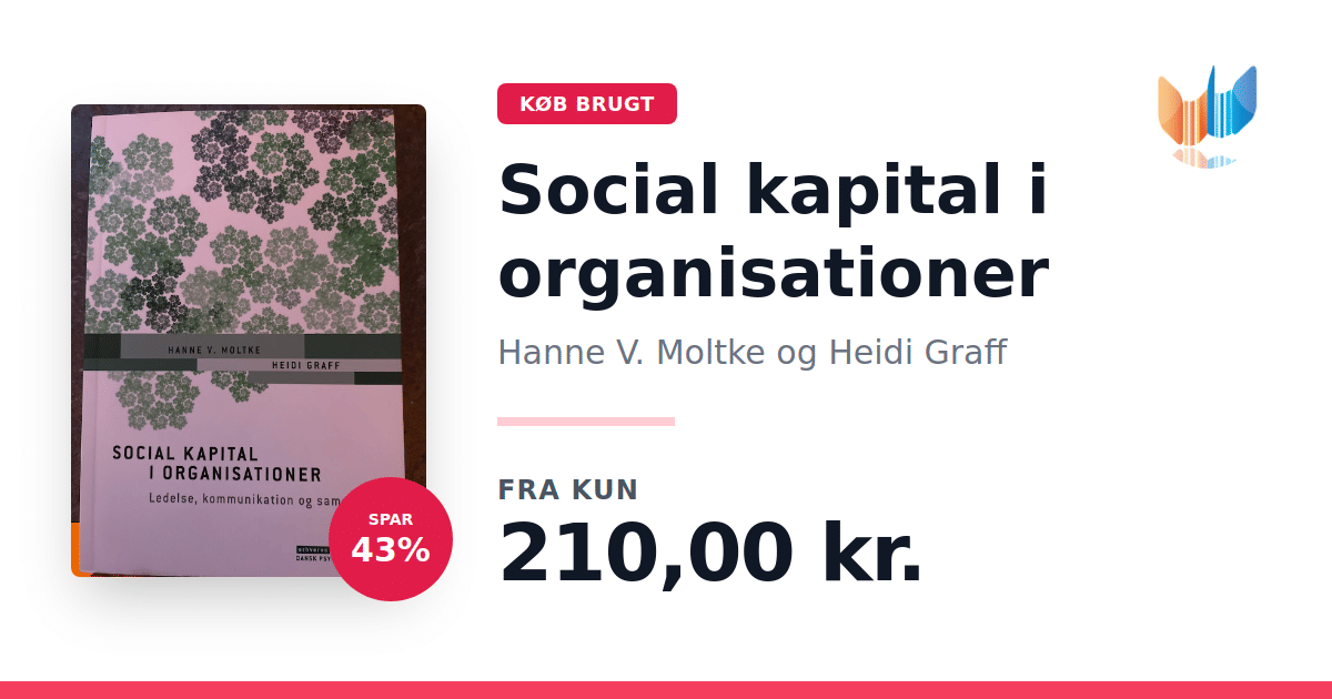 Lige nu kan du købe "Social kapital i organisationer" af Hanne V. Moltke og Heidi Graff til kun 210,00 kr. Du sparer hele 43% af nyprisen! Bogen du ser her er brugt, og i perfekt stand. Vi har i øjeblikket 2 eksemplarer til salg af "Social kapital i organisationer", så husk at se de forskellige udgaver.