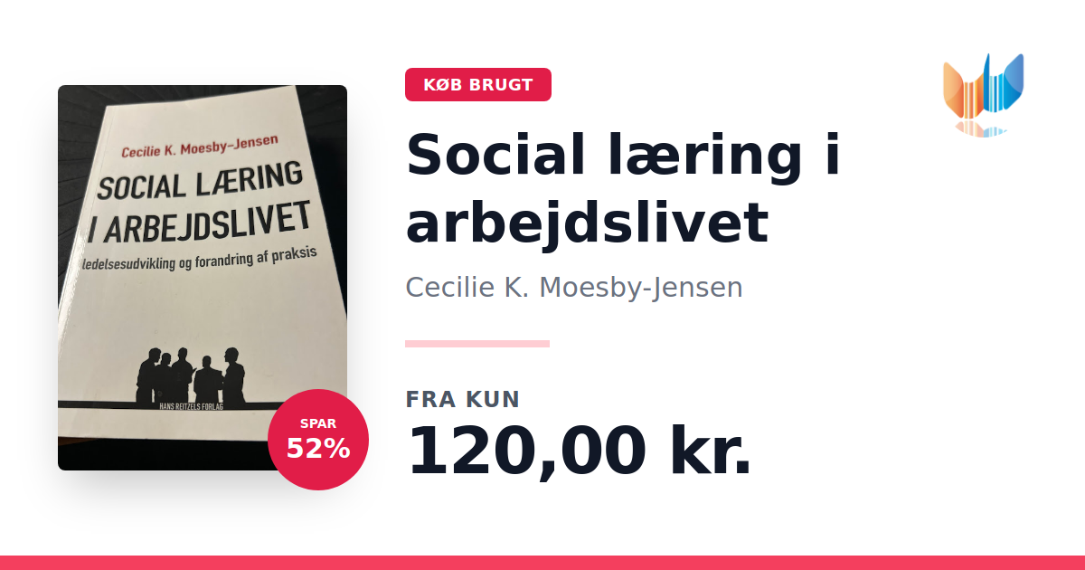 Lige nu kan du købe "Social læring i arbejdslivet" af Cecilie K. Moesby-Jensen til kun 120,00 kr. Du sparer hele 52% af nyprisen! Bogen du ser her er brugt, og i perfekt stand. Vi har i øjeblikket 3 eksemplarer til salg af "Social læring i arbejdslivet", så husk at se de forskellige udgaver.