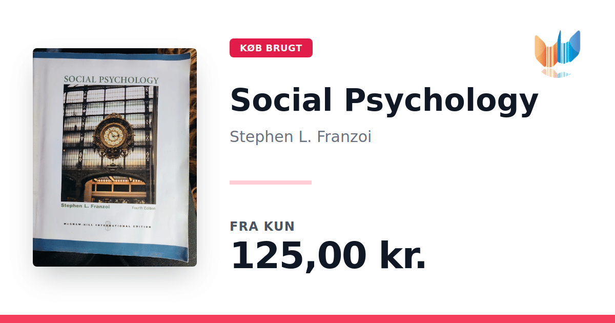 Lige nu kan du købe "Social Psychology" af Stephen L. Franzoi til kun 125,00 kr. Bogen du ser her er brugt, og i god stand. Vi har i øjeblikket 2 eksemplarer til salg af "Social Psychology", så husk at se de forskellige udgaver.