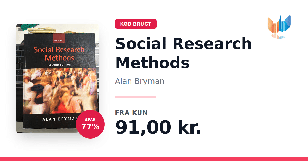 Social Research Methods af Alan Bryman er nu i sin 2. udgave og anerkendt som en grundbog inden for samfundsvidenskabelig metode. Bogen præsenterer med klarhed de centrale teorier og teknikker i både kvalitativ og kvantitativ forskning, så du får en solid forståelse af undersøgelsesdesign, dataindsamling og analyse. Udgivet i 2004 af Oxford University Press i paperback, omfatter den 608 sider spækket med faglig indsigt og praksisnære perspektiver. Den fuldt opdaterede udgave er trykt i to farver for at fremhæve nøglebegreber og skabe bedre overblik. Undervejs møder du talrige eksempler fra virkelige studier samt en række studiehjælpemidler, der guider dig fra teori til anvendelse og støtter din læring på hvert enkelt kapitel.