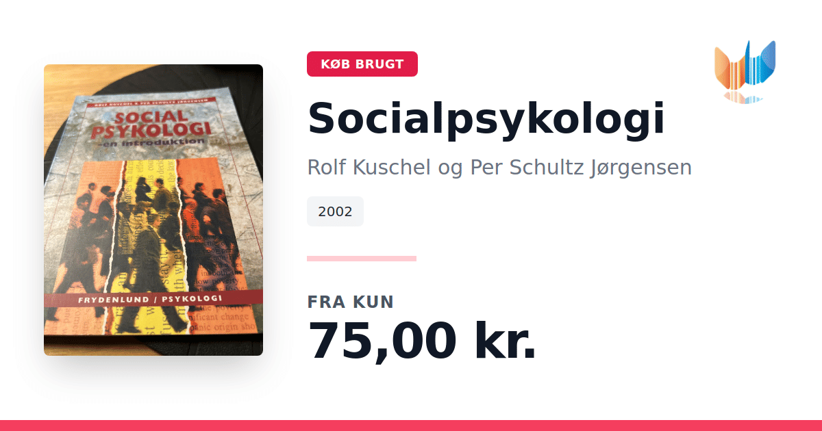 Lige nu kan du købe "Socialpsykologi" af Rolf Kuschel og Per Schultz Jørgensen til kun 75,00 kr. Bogen du ser her er brugt, og i perfekt stand. Vi har i øjeblikket 2 eksemplarer til salg af "Socialpsykologi", så husk at se de forskellige udgaver.