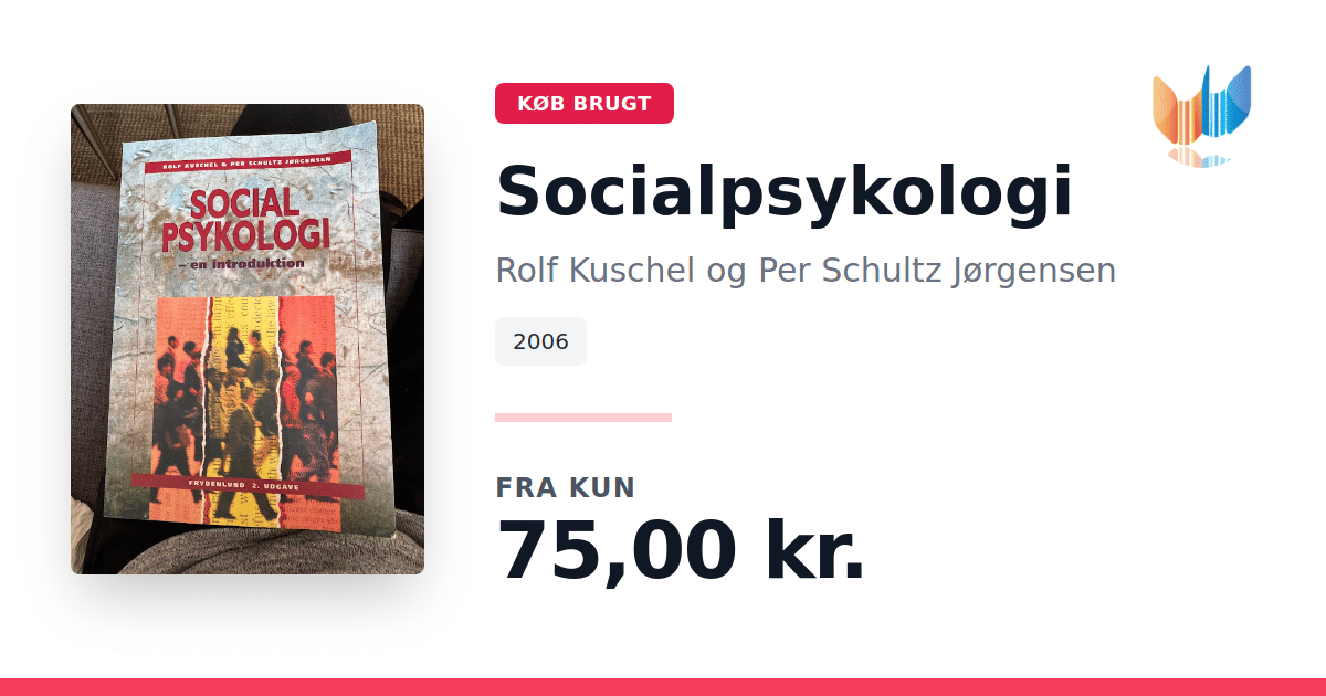 Lige nu kan du købe "Socialpsykologi" af Rolf Kuschel og Per Schultz Jørgensen til kun 75,00 kr. Bogen du ser her er brugt, og i god stand. Vi har i øjeblikket 2 eksemplarer til salg af "Socialpsykologi", så husk at se de forskellige udgaver.