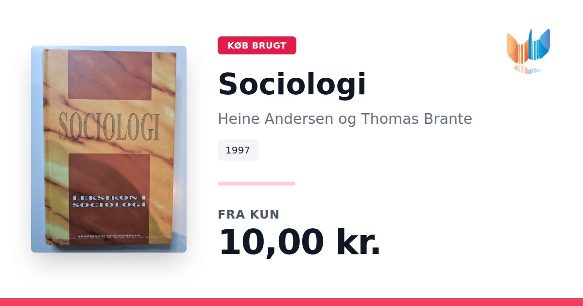 Lige nu kan du købe "Sociologi" af Heine Andersen og Thomas Brante til kun 10,00 kr. Bogen du ser her er brugt, og i god stand. Vi har i øjeblikket 6 eksemplarer til salg af "Sociologi", så husk at se de forskellige udgaver.