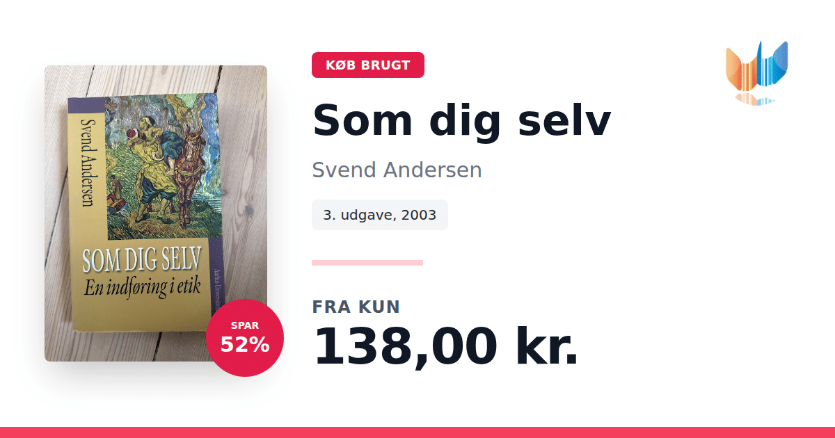 Lige nu kan du købe "Som dig selv" af Svend Andersen til kun 138,00 kr. Du sparer hele 52% af nyprisen! Bogen du ser her er brugt, og i god stand. Vi har i øjeblikket kun et enkelt eksemplar til salg af "Som dig selv", så slå til mens du kan!