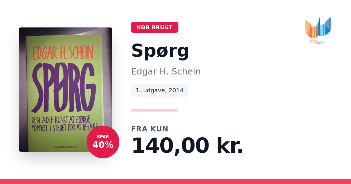 Lige nu kan du købe "Spørg" af Edgar H. Schein til kun 140,00 kr. Du sparer hele 40% af nyprisen! Bogen du ser her er brugt, og i perfekt stand. Vi har i øjeblikket kun et enkelt eksemplar til salg af "Spørg", så slå til mens du kan!