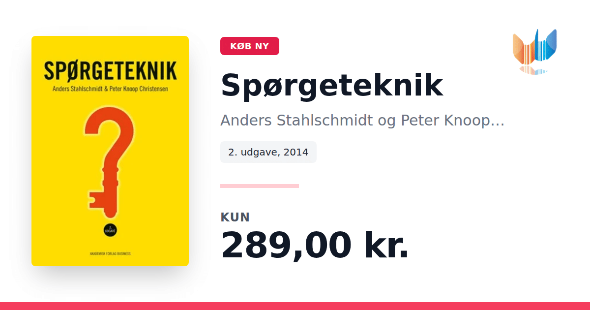 Med "Spørgeteknik" indbyder Anders Stahlschmidt og Peter Knoop Christensen læseren til at mestre kunsten at stille de rigtige spørgsmål og dermed styre enhver samtale. Bogen introducerer en række velafprøvede metoder, der effektivt kan anvendes i både professionelle og private sammenhænge – om du som leder, sælger, journalist eller underviser ønsker at få det bedst mulige svar. Gennem 296 sider præsenteres et grundigt overblik over interview- og samtaleteknik, hvor fokus ligger på, hvordan spørgsmål både kan udfordre, udvikle og ændre dialogens retning. Med praktiske redskaber og konkrete eksempler giver denne bog dig den nødvendige viden til at skabe mere dybdegående samtaler, hvor både nysgerrighed og præcision går hånd i hånd.