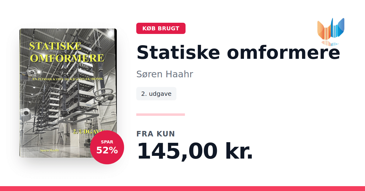 Lige nu kan du købe "Statiske omformere" af Søren Haahr til kun 145,00 kr. Du sparer hele 52% af nyprisen! Bogen du ser her er brugt, og i perfekt stand. Vi har i øjeblikket 2 eksemplarer til salg af "Statiske omformere", så husk at se de forskellige udgaver.