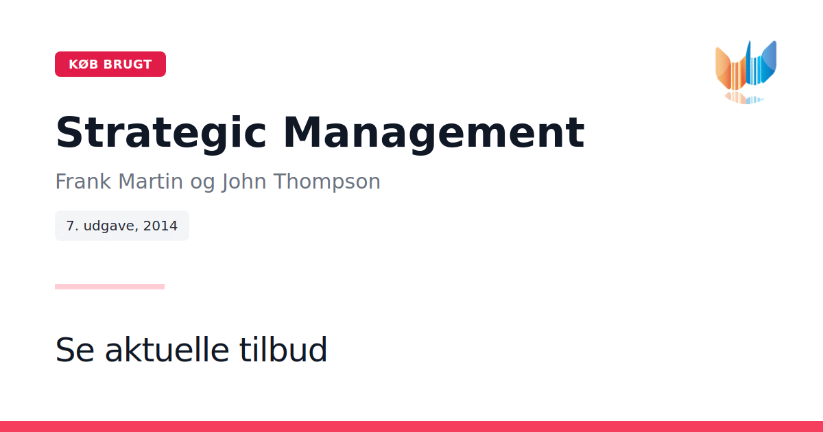 Strategic Management: Awareness and Change (7. udgave, 2014) af Frank Martin og John Thompson præsentere en moderne tilgang til strategisk ledelse, hvor bevidsthed om omverdenen og evnen til forandring står i centrum. Gennem en klar og fokuseret gennemgang af de grundlæggende teorier opbygges forståelsen for, hvordan virksomheder tilpasser sig skiftende markedsforhold. Bogen er beriget med dybdegående, klasseafprøvede case-studier, der demonstrerer de vigtigste elementer i virksomhedsstrategi fra teori til praksis. Hvert eksempel er nøje udvalgt for at belyse beslutningsprocesser, konkurrencemæssige fordele og effektive implementeringsmetoder. Med sine 250 sider i praktisk paperback-format tilbyder denne udgave et overblik over de nyeste tendenser inden for strategisk tænkning. Den er målrettet både studerende, undervisere og ledelsesprofessionelle, der ønsker en opdateret og anvendelsesorienteret indføring i feltets kerneområder.