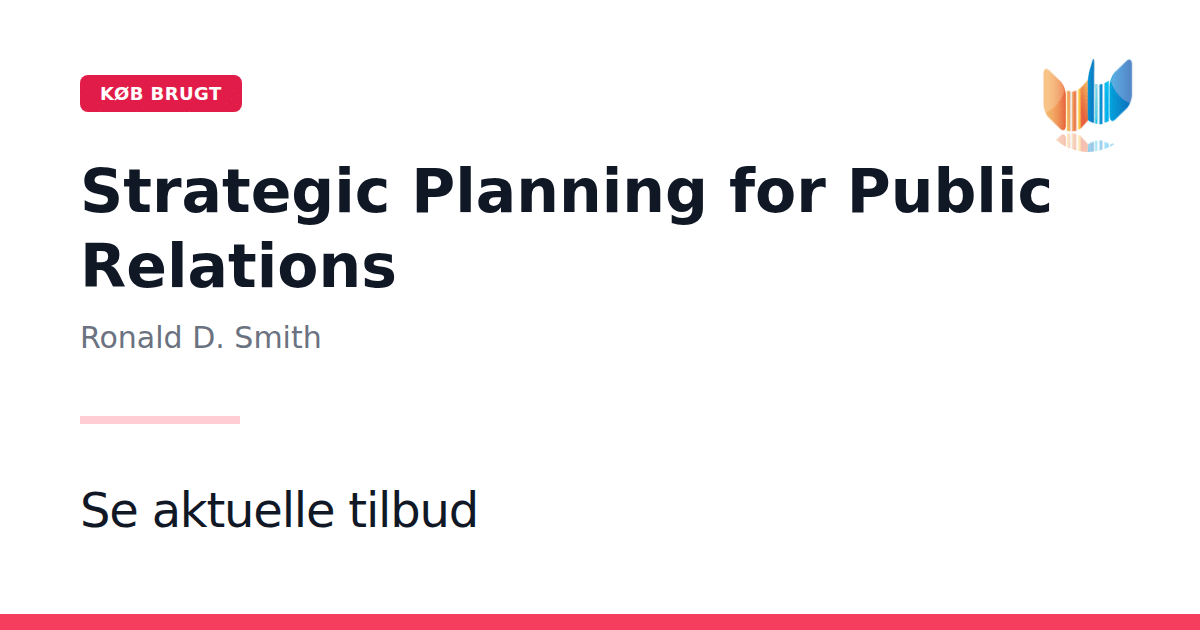 Strategic Planning for Public Relations giver en klar og systematisk fremstilling af, hvordan man planlægger og gennemfører effektive PR- og kommunikationskampagner. Bogen præsenterer et gennemprøvet rammeværk, der ledetråd for hele planlægningsprocessen fra start til slut. Ronald D. Smith fører læseren trin for trin igennem strategiske overvejelser, research, målformulering, taktikvalg, implementering og evaluering. Hver fase illustreres med praktiske redskaber og modeller, der bygger på solidt fagligt fundament og erfaringer fra virkelighedens praksis. Med eksempler og cases får man indblik i, hvordan teorien omsættes til handling, og hvordan man tilpasser strategien til forskellige målgrupper og situationer. Bogen er velegnet både som lærebog i PR-kurser og som opslagsværk for den praktiserende kommunikatør.