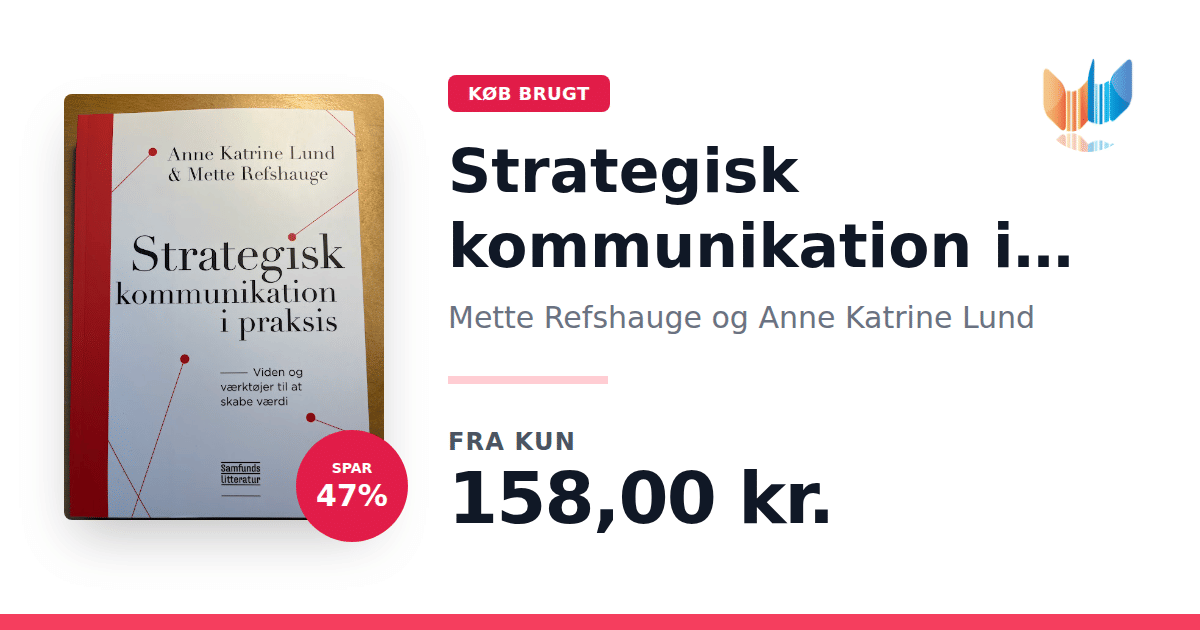Lige nu kan du købe "Strategisk kommunikation i praksis" af Mette Refshauge og Anne Katrine Lund til kun 158,00 kr. Du sparer hele 47% af nyprisen! Bogen du ser her er brugt, og i perfekt stand. Vi har i øjeblikket kun et enkelt eksemplar til salg af "Strategisk kommunikation i praksis", så slå til mens du kan!