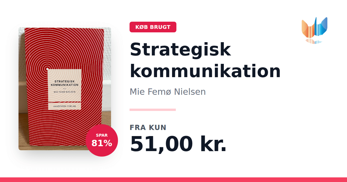 Lige nu kan du købe "Strategisk kommunikation" af Mie Femø Nielsen til kun 51,00 kr. Du sparer hele 81% af nyprisen! Bogen du ser her er brugt, og i god stand. Vi har i øjeblikket 2 eksemplarer til salg af "Strategisk kommunikation", så husk at se de forskellige udgaver.