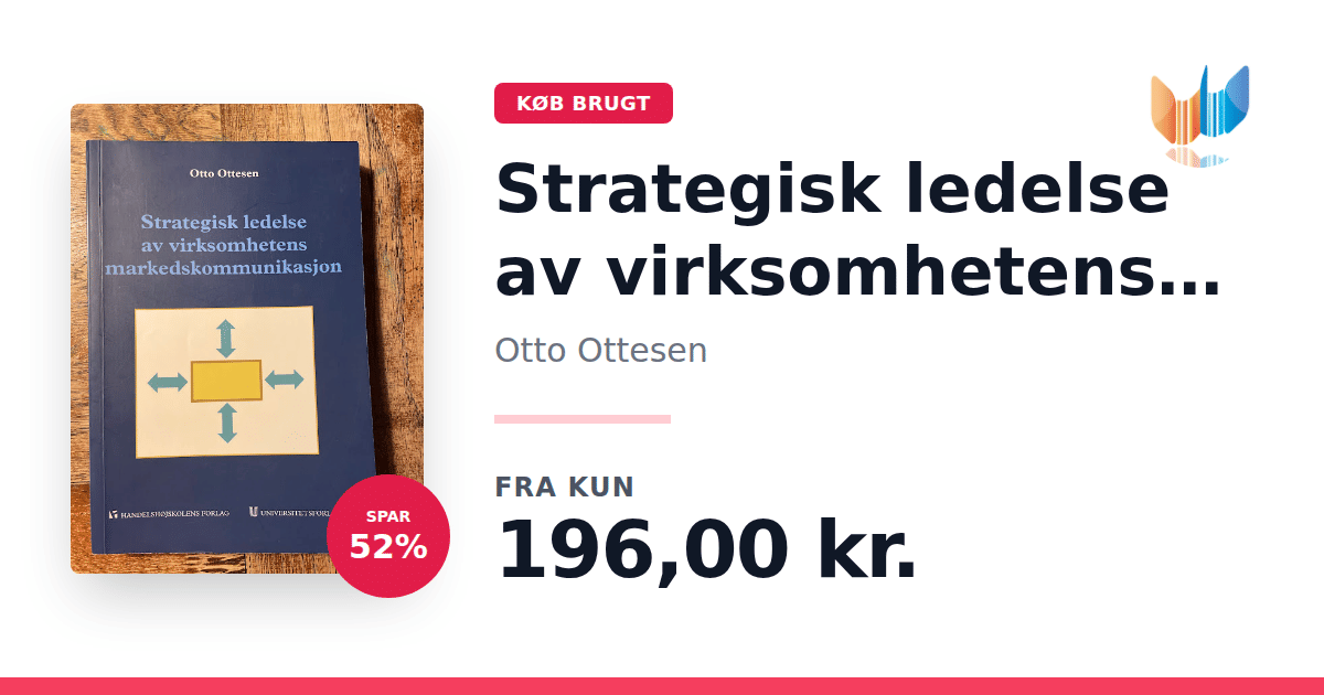 Lige nu kan du købe "Strategisk ledelse av virksomhetens kommunikasjon" af Otto Ottesen til kun 196,00 kr. Du sparer hele 52% af nyprisen! Bogen du ser her er brugt, og i god stand. Vi har i øjeblikket kun et enkelt eksemplar til salg af "Strategisk ledelse av virksomhetens kommunikasjon", så slå til mens du kan!