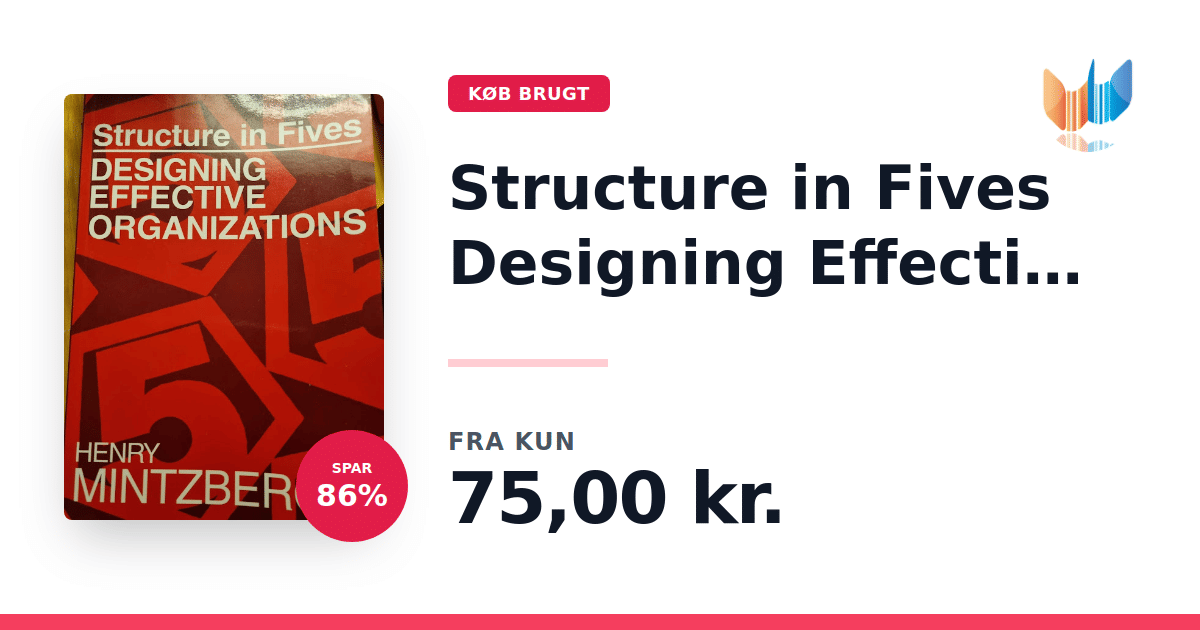 Lige nu kan du købe "Structure in Fives Designing Effective Organizations" til kun 75,00 kr. Du sparer hele 86% af nyprisen! Bogen du ser her er brugt, og i perfekt stand. Vi har i øjeblikket 2 eksemplarer til salg af "Structure in Fives Designing Effective Organizations", så husk at se de forskellige udgaver.