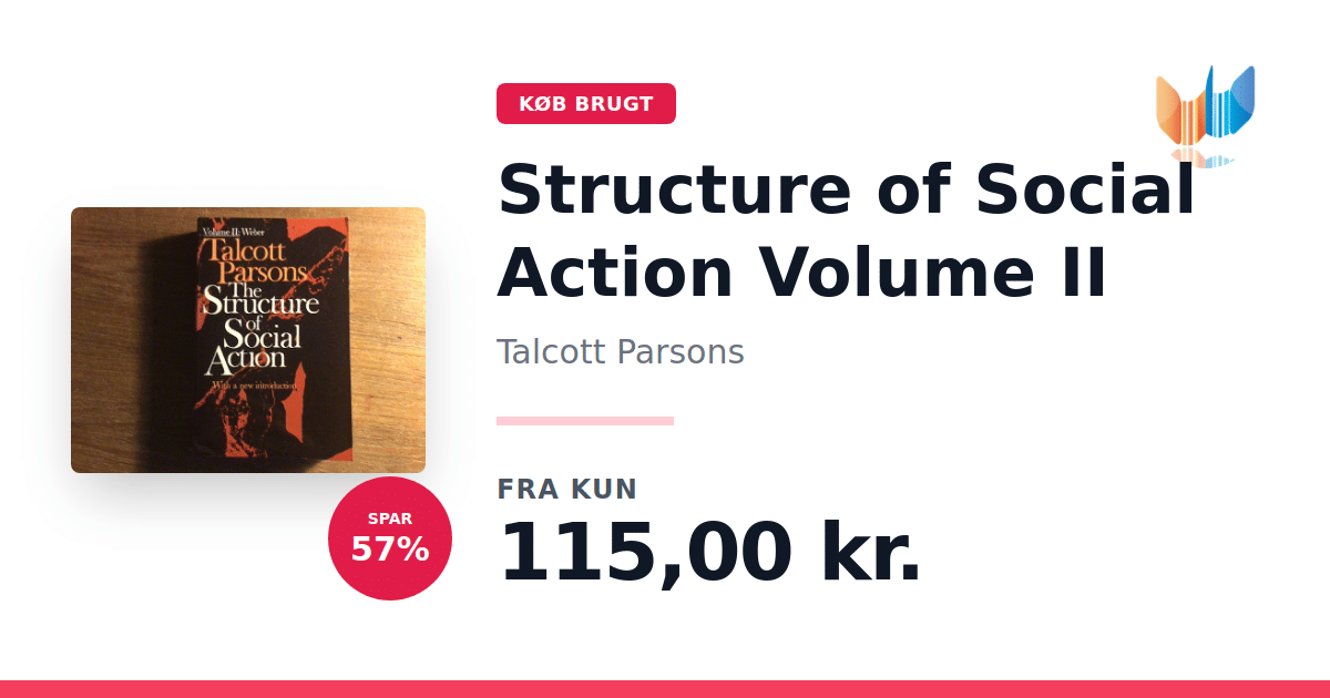 Lige nu kan du købe "Structure of Social Action Volume II " af Talcott Parsons til kun 115,00 kr. Du sparer hele 57% af nyprisen! Bogen du ser her er brugt, og i perfekt stand. Vi har i øjeblikket kun et enkelt eksemplar til salg af "Structure of Social Action Volume II ", så slå til mens du kan!