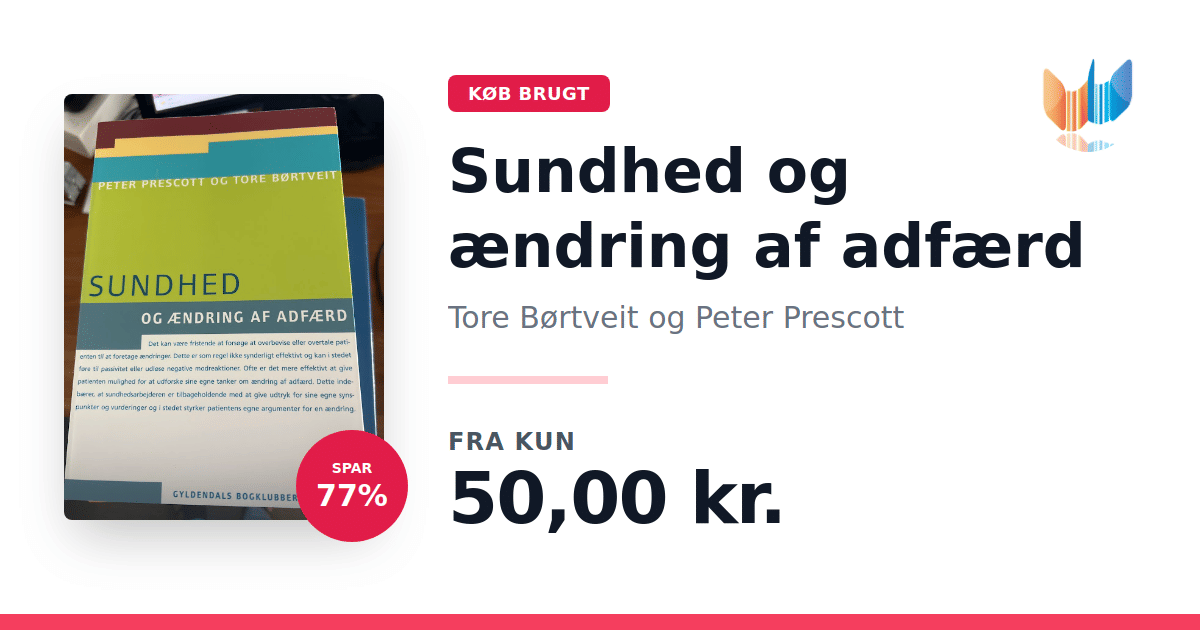 Lige nu kan du købe "Sundhed og ændring af adfærd" af Tore Børtveit og Peter Prescott til kun 50,00 kr. Du sparer hele 77% af nyprisen! Bogen du ser her er brugt, og i perfekt stand. Vi har i øjeblikket 2 eksemplarer til salg af "Sundhed og ændring af adfærd", så husk at se de forskellige udgaver.