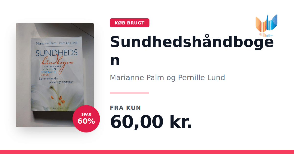 Lige nu kan du købe "Sundhedshåndbogen" af Marianne Palm og Pernille Lund til kun 60,00 kr. Du sparer hele 60% af nyprisen! Bogen du ser her er brugt, og i god stand. Vi har i øjeblikket kun et enkelt eksemplar til salg af "Sundhedshåndbogen", så slå til mens du kan!