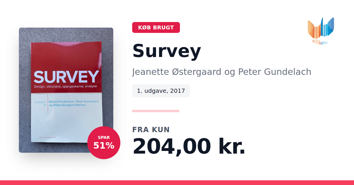 "Survey" giver en grundig og praktisk indføring i den komplekse proces bag udformning af et solidt survey. Bogen skitserer de essentielle faser i arbejdet med surveys – lige fra design og stikprøveudvælgelse til formuleringen af spørgeskemaer og kodning af de indsamlede data. Hvert kapitel bygger på konkrete eksempler, der illustrerer, hvordan man opnår meningsfulde og pålidelige resultater, der svarer til undersøgelsens centrale spørgsmål. Anvendeligheden af surveys dækker et bredt spektrum af fagområder, herunder humaniora, samfundsvidenskab, psykologi, marketing og sundhedsforskning. "Survey" henvender sig derfor både til forskere og praktikere, der ønsker at styrke deres metodiske værktøjskasse. Bogen er redigeret af en række erfarne fagfolk og tilbyder en systematisk guide til hele processen med at planlægge og gennemføre en veldesignet undersøgelse.