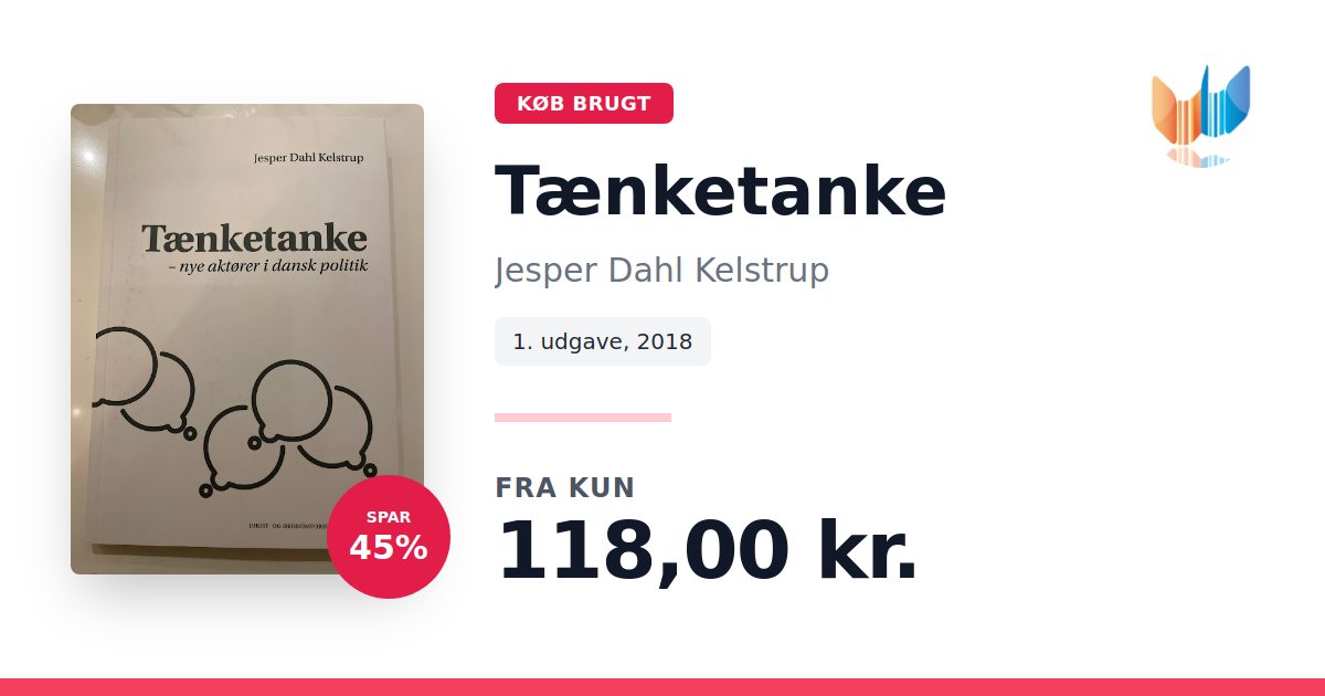 Lige nu kan du købe "Tænketanke" af Jesper Dahl Kelstrup til kun 118,00 kr. Du sparer hele 45% af nyprisen! Bogen du ser her er brugt, og i perfekt stand. Vi har i øjeblikket kun et enkelt eksemplar til salg af "Tænketanke", så slå til mens du kan!