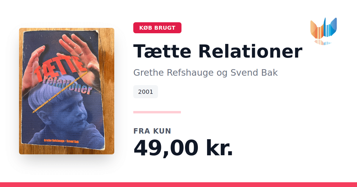 Lige nu kan du købe "Tætte Relationer" af Grethe Refshauge og Svend Bak til kun 49,00 kr. Bogen du ser her er brugt, og i slidt stand. Vi har i øjeblikket kun et enkelt eksemplar til salg af "Tætte Relationer", så slå til mens du kan!