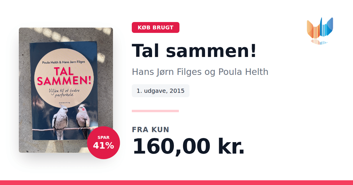 Lige nu kan du købe "Tal sammen!" af Hans Jørn Filges og Poula Helth til kun 160,00 kr. Du sparer hele 41% af nyprisen! Bogen du ser her er brugt, og i perfekt stand. Vi har i øjeblikket kun et enkelt eksemplar til salg af "Tal sammen!", så slå til mens du kan!