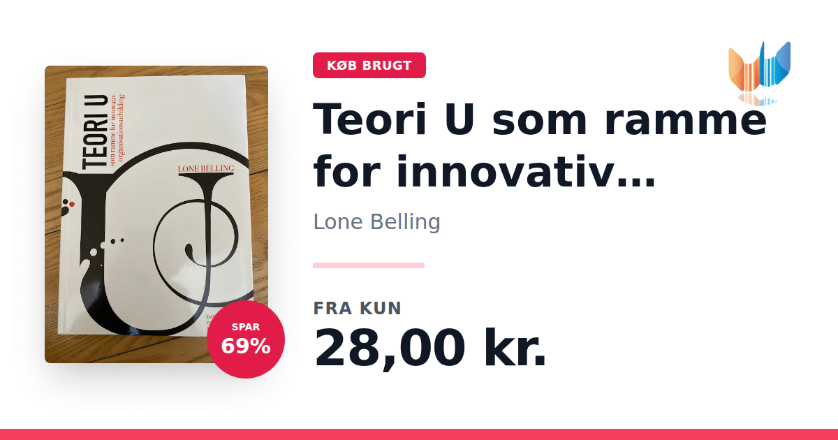 Lige nu kan du købe "Teori U som ramme for innovativ organisationsudvikling" af Lone Belling til kun 28,00 kr. Du sparer hele 69% af nyprisen! Bogen du ser her er brugt, og i perfekt stand. Vi har i øjeblikket kun et enkelt eksemplar til salg af "Teori U som ramme for innovativ organisationsudvikling", så slå til mens du kan!