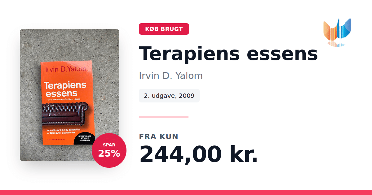 Lige nu kan du købe "Terapiens essens" af Irvin D. Yalom til kun 244,00 kr. Du sparer hele 25% af nyprisen! Bogen du ser her er brugt, og i perfekt stand. Vi har i øjeblikket kun et enkelt eksemplar til salg af "Terapiens essens", så slå til mens du kan!