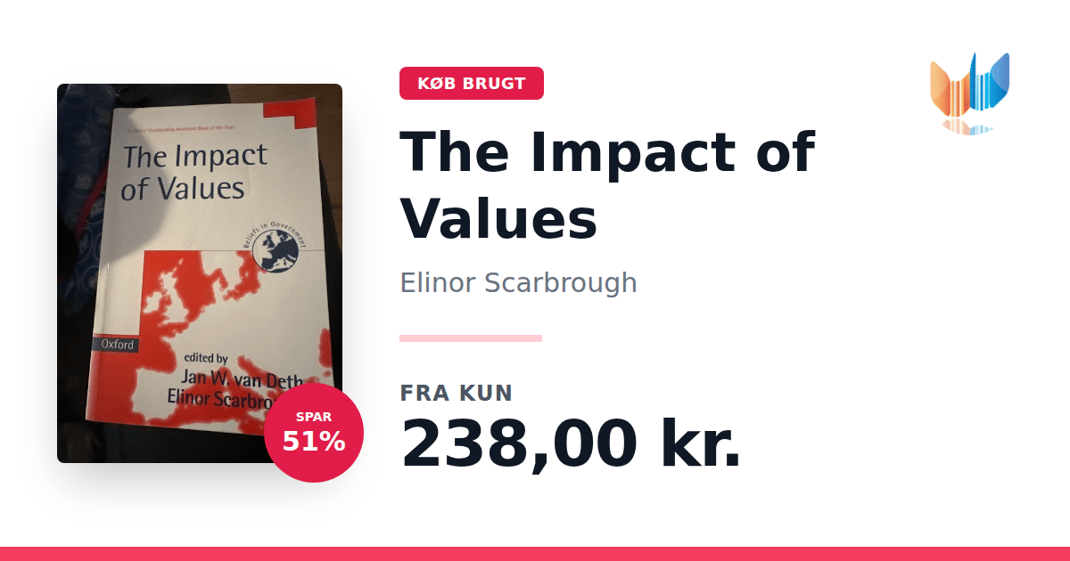 Lige nu kan du købe "The Impact of Values" af Elinor Scarbrough til kun 238,00 kr. Du sparer hele 51% af nyprisen! Bogen du ser her er brugt, og i god stand. Vi har i øjeblikket kun et enkelt eksemplar til salg af "The Impact of Values", så slå til mens du kan!