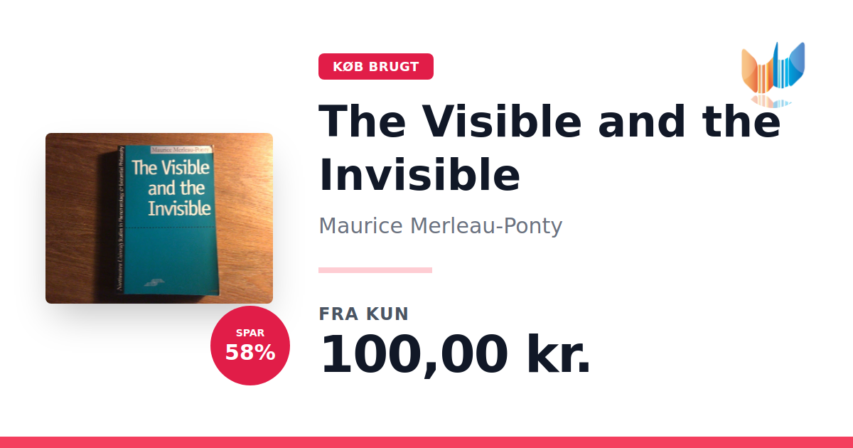 Lige nu kan du købe "The Visible and the Invisible" af Maurice Merleau-Ponty til kun 100,00 kr. Du sparer hele 58% af nyprisen! Bogen du ser her er brugt, og i perfekt stand. Vi har i øjeblikket kun et enkelt eksemplar til salg af "The Visible and the Invisible", så slå til mens du kan!