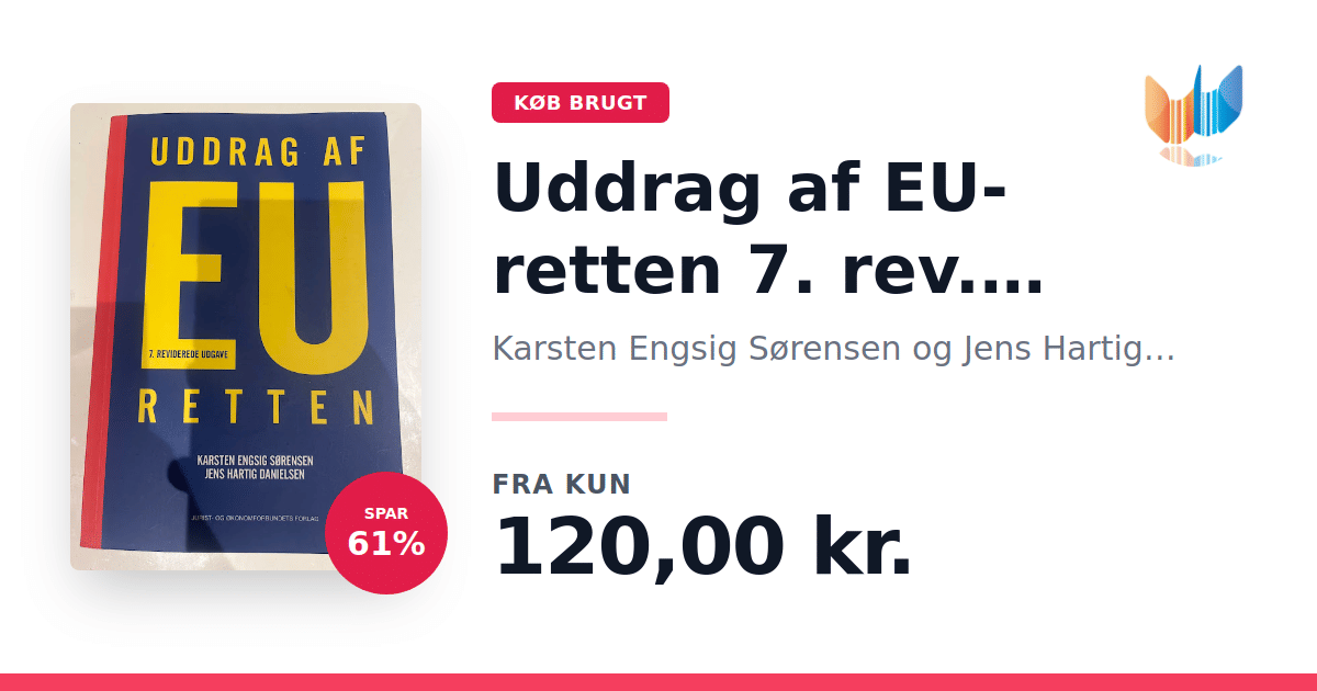 Lige nu kan du købe "Uddrag af EU-retten 7. rev. udgave" af Karsten Engsig Sørensen og Jens Hartig Danielsen til kun 120,00 kr. Du sparer hele 61% af nyprisen! Bogen du ser her er brugt, og i god stand. Vi har i øjeblikket kun et enkelt eksemplar til salg af "Uddrag af EU-retten 7. rev. udgave", så slå til mens du kan!