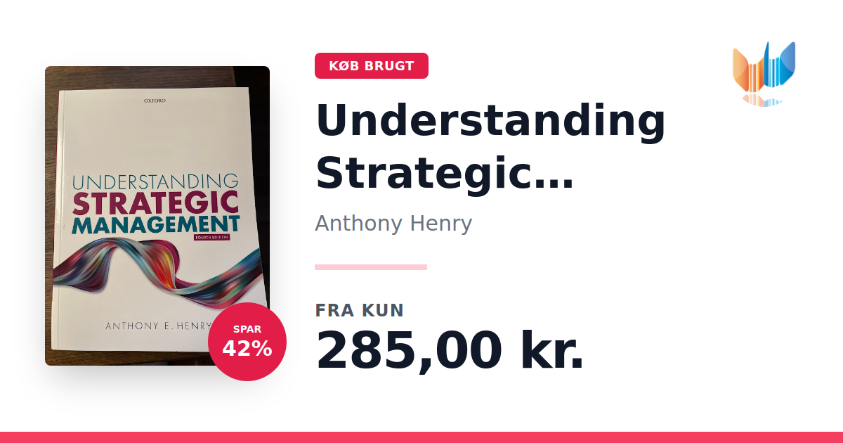 Lige nu kan du købe "Understanding Strategic Management" af Anthony Henry til kun 285,00 kr. Du sparer hele 42% af nyprisen! Bogen du ser her er brugt, og i perfekt stand. Vi har i øjeblikket 7 eksemplarer til salg af "Understanding Strategic Management", så husk at se de forskellige udgaver.