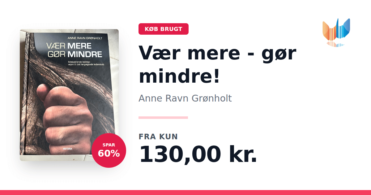Lige nu kan du købe "Vær mere - gør mindre!" af Anne Ravn Grønholt til kun 130,00 kr. Du sparer hele 60% af nyprisen! Bogen du ser her er brugt, og i perfekt stand. Vi har i øjeblikket kun et enkelt eksemplar til salg af "Vær mere - gør mindre!", så slå til mens du kan!