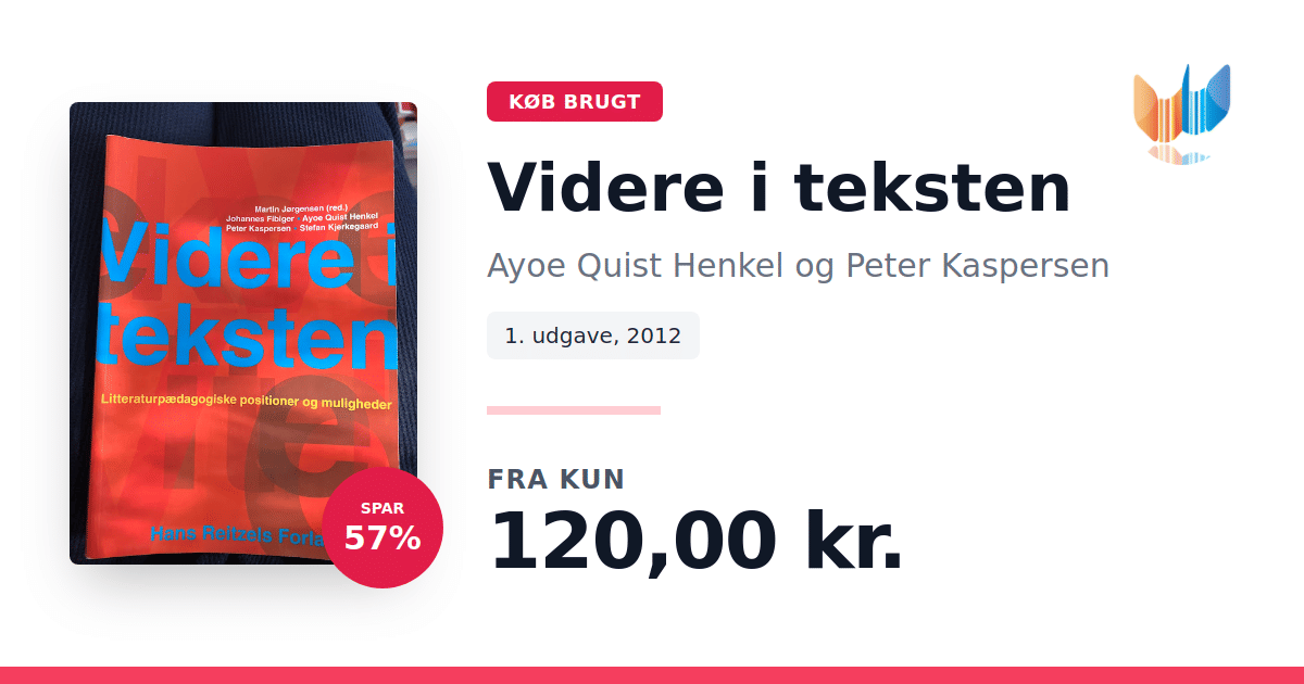 Lige nu kan du købe "Videre i teksten" af Ayoe Quist Henkel og Peter Kaspersen til kun 120,00 kr. Du sparer hele 57% af nyprisen! Bogen du ser her er brugt, og i god stand. Vi har i øjeblikket 2 eksemplarer til salg af "Videre i teksten", så husk at se de forskellige udgaver.