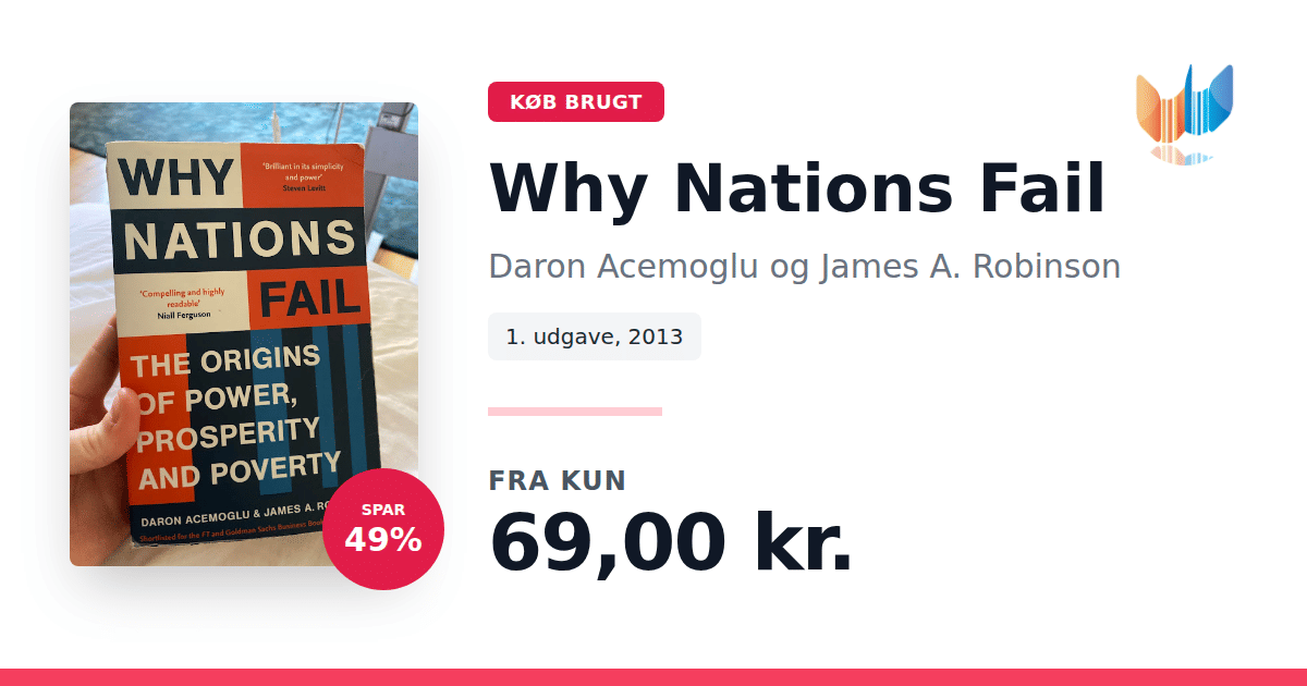 Lige nu kan du købe "Why Nations Fail" af Daron Acemoglu og James A. Robinson til kun 69,00 kr. Du sparer hele 49% af nyprisen! Bogen du ser her er brugt, og i perfekt stand. Vi har i øjeblikket kun et enkelt eksemplar til salg af "Why Nations Fail", så slå til mens du kan!