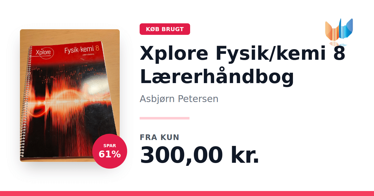Lige nu kan du købe "Xplore Fysik/kemi 8 Lærerhåndbog" af Asbjørn Petersen til kun 300,00 kr. Du sparer hele 61% af nyprisen! Bogen du ser her er brugt, og i god stand. Vi har i øjeblikket 3 eksemplarer til salg af "Xplore Fysik/kemi 8 Lærerhåndbog", så husk at se de forskellige udgaver.