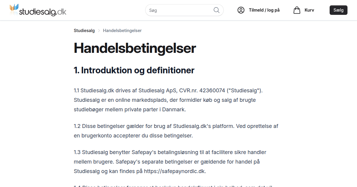 1.3 Studiesalg benytter Safepay's betalingsløsning til at facilitere sikre handler mellem brugere. Safepay's separate betingelser er gældende for handel på Studiesalg og kan findes på https://safepaynordic.dk.