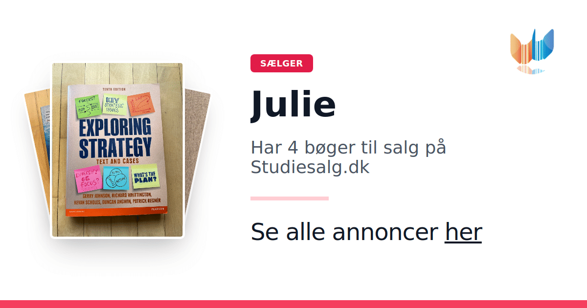 Sæt dine bøger gratis til salg på Studiesalg.dk. Det er tager få minutter, og vi står for betaling og fragt når de bliver solgt.